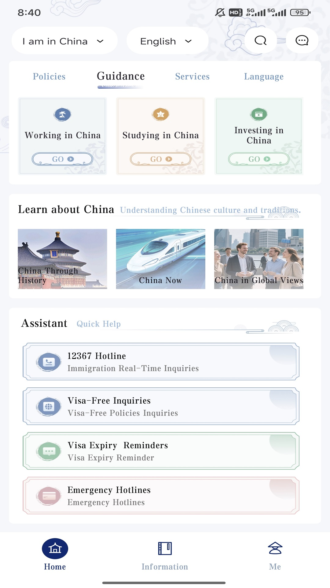 SinoGuide APP é um aplicativo integral tudo-em-um para estrangeiros que vêm à China e residem na China, integrando orientação política, informações de notícias, serviços da vida diária e suporte linguístico. A plataforma fornece informações autorizadas nos campos de assuntos governamentais, serviços públicos, economia, ciência e tecnologia em chinês e inglês, e integra 31 funções de serviços online comuns, como pagamentos, transporte, cuidados médicos e educação, cobrindo cenários de alta frequência, como consultas de políticas de entrada e saída, lembretes de expiração de estadia, consultas de taxas de câmbio, pagamentos online, chamada de táxi com um clique, pedido de comida, pagamento de contas de serviços públicos e aprendizado de idiomas. Também suporta a tradução com um clique de páginas em chinês, ajudando pessoas internacionais a experimentar completamente a vida digital eficiente, conveniente e amigável da China.